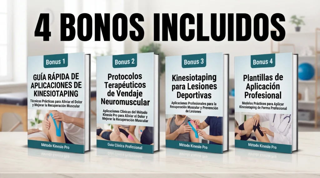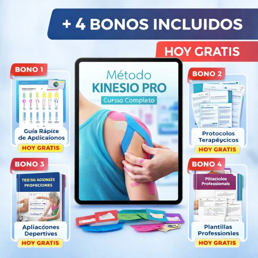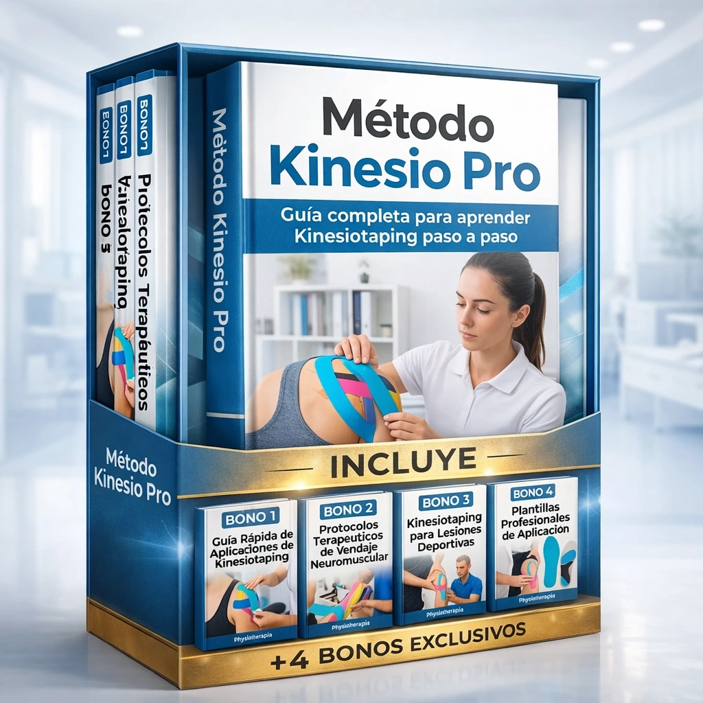 BONO 1 - Guía Rápida de Aplicacionees de KinesiotapingUna guía práctica del Método Kinesio Pro que muestra aplicaciones paso a paso del vendaje neuromuscular para diferentes zonas del cuerpo. Aprende cómo reducir el dolor, mejorar la función muscular y acelerar la recuperación con técnicas utilizadas en fisioterapia y rehabilitación deportiva.